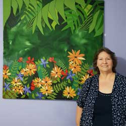 Her style of art has been described sometimes as whimsical; creating her own genre with vivid and colourful floral images, jungle themes and she sometimes creates artwork with a strong African flavour. Alison typically paints straight onto the canvas, relying solely on her imagination, passion and current sources of inspiration.