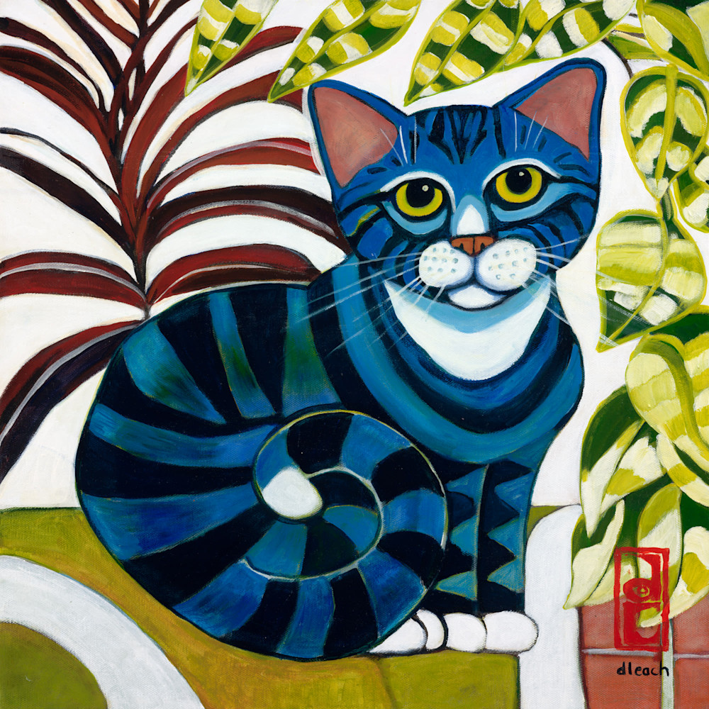 Minna is a stylised version of a tabby cat. She is bright eyed with lovely markings and is sitting in a rather well kept garden. She is watching keenly what is going on around her and has kept her white bib and her white socks very clean. Mark Twain said If a man could be crossed with a cat it would improve the man, but it would deteriorate the cat.