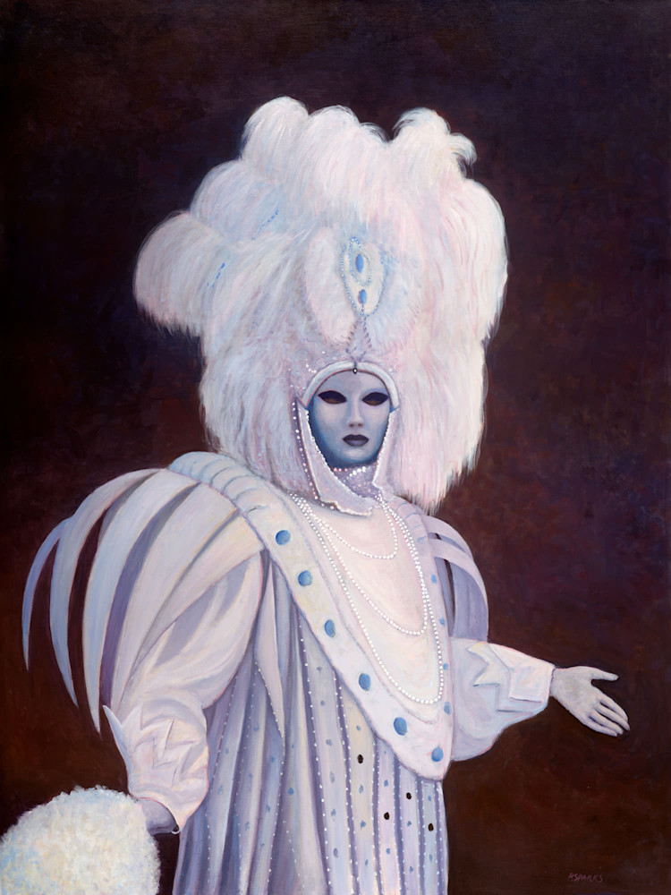 This artwork was inspired by the Venice Carnival, where the image of a lady dressed in white with an amazing head piece really created a sense of mystery to me. The Venice Carnival takes place during the month of February each year and is truly a time of dreams and intrigue. The earliest evidence of Carnival celebrations in Venice dates from the year 1094 A D. The carnival ends with Lent, forty days before Easter on Shrove Tuesday, the day before Ash Wednesday. The artwork depicts a woman standing St Marks Square at the festival.